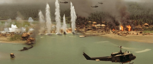 Part of the problem lies in the inherent ambiguities of movie action scenes. As academic Claudia Springer has written, combat sequences are unable to fully capture an anti-war message, because their visual excess encourages “the pleasure of looking.” Combat scenes are inherently dramatic and exciting, drawing the viewer into the experience as an eager spectator. The deeds shown in Apocalypse Now’s helicopter scene are objectively monstrous, but by turning them into a big-budget action set piece, Coppola turned an anti-war critique into an orgy of reveling in the awesome brutality of war.