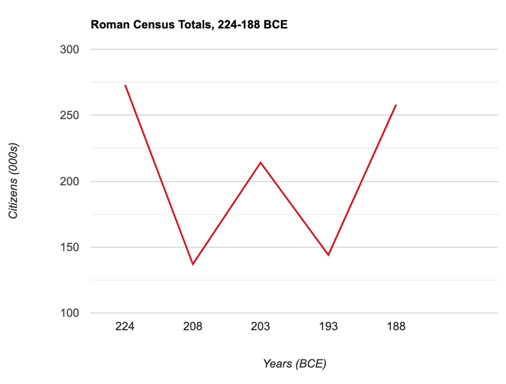 Please note that this is certainly a huge undercount, since the above list excludes both skirmishes and all battles for which the sources give no numbers of Roman dead. Furthermore, Roman women and children would also have died in the war, as Hannibal’s Carthaginian army ravaged the Italian countryside. The Roman census (admittedly an imprecise measure) reflects the immense carnage of the war. In 208, the census reported 137,108 Roman citizens, down from 273,000 in 224.