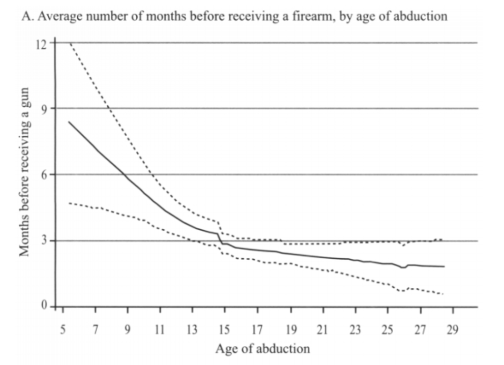 Authors describing child soldiers often suggest that armed groups immediately hand their child recruits a gun and send them off to die in combat. However, this is not usually accurate. Studies of child soldiers in Liberia and elsewhere shows that most child soldiers don’t receive a weapon for many months. Those months involved intense training, but the aim of that training was more often to instill loyalty and obedience, rather than teaching children to fight with weapons.
