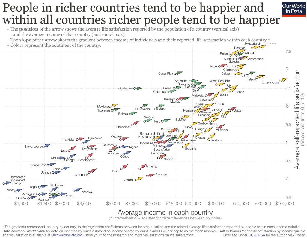 So which theory is correct? Unfortunately, we don’t have any accurate data about the general happiness of populations from more than about 40 years ago, but we do have more recent data. Let’s examine what factors correlate to happiness in modern countries, and see what that tells us about the nature of general happiness.