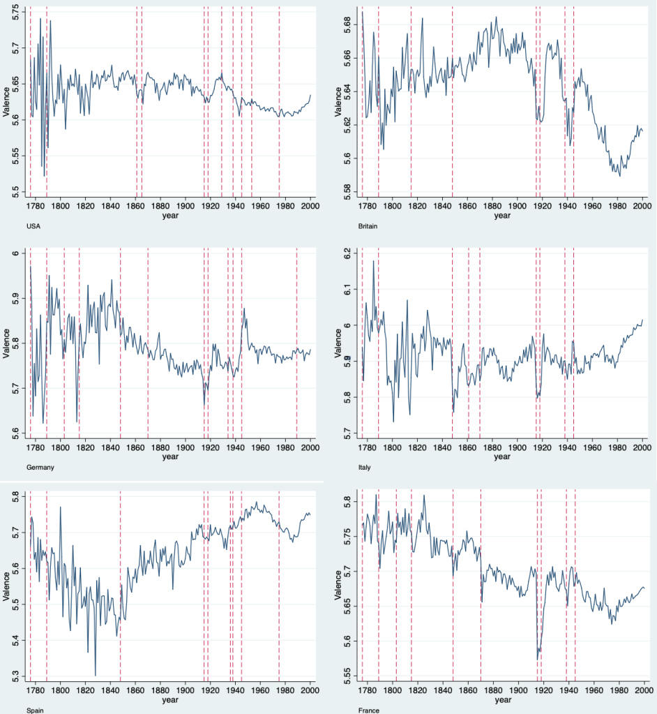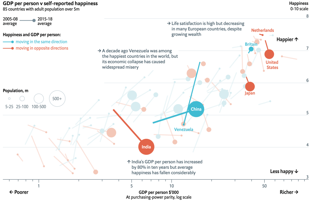 In the absence of good survey data, researchers have embarked on more quixotic methods of data collection. One such study examined millions of books and articles written between 1820 and 2009, looking for the frequency of words relating to happiness or sadness. The study found that growth in GDP and life expectancy tends to lead to high happiness. In general, it found that happiness levels tend to remain fairly similar, a surprising conclusion since over the course of the study’s time frame, the lifestyle of most people fundamentally changed. Given the eccentric source of the data, however, I would be careful not to place too much trust in the conclusions.
