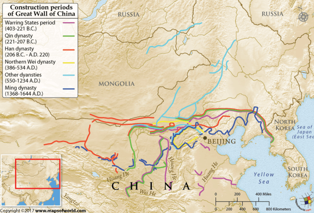 Perhaps the most famous fortification in the entire world, the Great Wall of China stretches across thousands of miles of the northern Chinese frontier. Yet the wall was not one project. Various dynasties constructed many walls over a period of 2000 years, all of which are collectively considered the Great Wall.