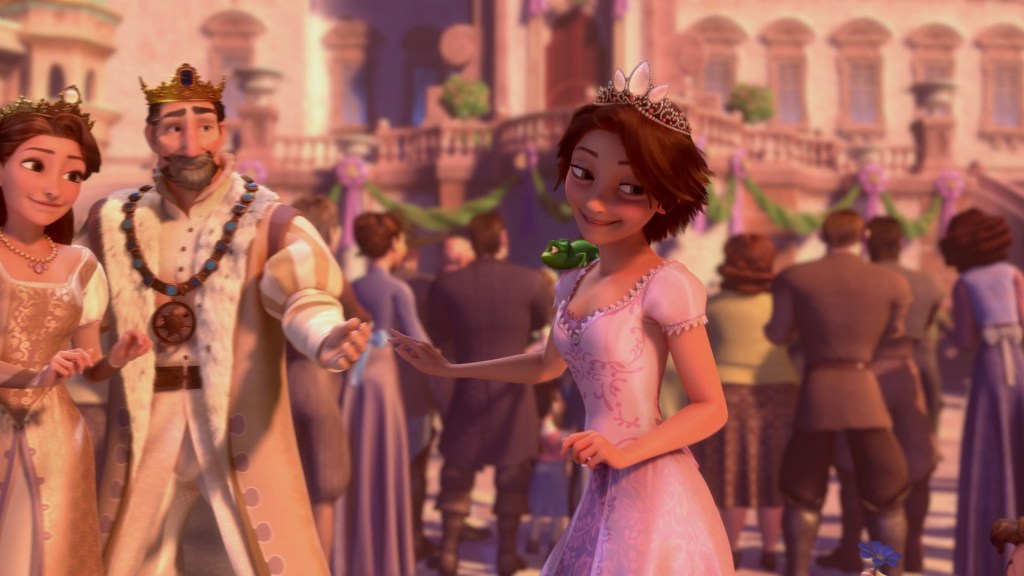 After the lost princess’ “return,” one can only imagine that the king and queen went through some hasty calculations. How much military force was behind this new claimant? Could the crown win a potential civil war? Probably not, given that the soldiers seem vulnerable even to frying pans. The only sensible decision, then was to embrace Rapunzel as the rightful heir, thus averting a rebellion.