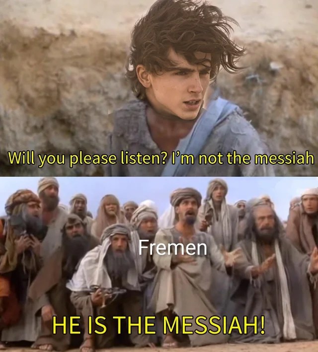 Instead of Stilgar, Denis Villeneuve makes Chani the most important Fremen character. I actually really like Chani’s story in the movie, but there’s a key difference. Chani’s rejection of Paul’s authority makes her an exception, while Stilgar’s journey to accepting Paul is representative of the Fremen as a whole. Chani’s story might make for great drama, but it still leaves the rest of the Fremen looking like idiots (just look at the memes above).